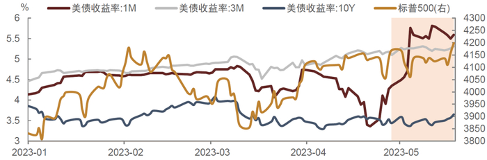 若如此,在债务上限解决前,短端美债收益率和美元指数或在避险情绪支撑下维持高位运行,长端美债收益率则可能随双方谈判进展而波动。进一步往后看,若债务上限问题得以解决,那么财政部将重新恢复发债。届时若美联储仍维持紧缩且供给增加,那么美债收益率可能仍面临一定上行压力,并对避险情绪减弱后的美元形成一定支撑。我们认为短期内2年期美债收益率可能回升到4.5%附近或者更高,10年期美债收益率可能回升到3.8%-4%。