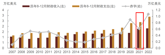 2021年8月1日,此前暂停的债务上限(22万亿美元)重新生效,而当时美国国债余额已经达到28.4万亿美元。但两党仍有分歧,共和党认为民主党可通过预算调节程序单独推动提高债务上限的法案,共和党不会支持提高债务上限;但使用预算调节程序耗时较长、且民主党也不想单独承担提高债务上限的责任,因此反对通过预算调节程序将提高债务上限与大规模支出法案捆绑在一起。经过持续谈判,国会分别于当年10月和12月将债务上限提高4800亿美元和2.5万亿美元,最终提高至31.4万亿美元。由于2021年美国经济势头较好、税收水平较高,因此市场受到的影响也相对有限。