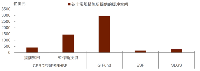 2023年1月19日美国国债再次触及债务上限,财政部进入“debt issuance suspension period”、直至2023年6月5日。同日,财政部开始采取非常规措施,包括暂停及提前赎回CSRDF和PSRHBF下的投资、暂停G Fund下的投资、暂停ESF下的投资、暂停SLGS国债发行等。根据财政部对前述非常规措施的介绍[2],在“debt issuance suspension period”内提前赎回CSRDF和PSRHBF下的投资可释放约410亿美元的空间,暂停新投资可释放约1455亿美元的空间;暂停G Fund下的投资可释放约2940亿美元的空间(财政部按照2022年末G Fund规模估计);暂停ESF可释放约170亿美元的空间;暂停SLGS国债发行平均每个月可释放约60亿美元的空间(我们按照“debt issuance suspension period”4.5个月估计大约折合270亿美元)。合计来看,在债务上限被再次提高或者暂停之前,非常规措施可为财政部提供的缓冲空间大概在5200亿美元左右。