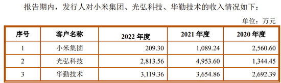 2020年、2021年、2022年,公司向小米集团(含小米通讯技术有限公司、北京小米移动软件有限公司、PT.Xiaomi Technology Indonesia)关联销售收入的金额分别为 2,560.60 万元、1,089.24 万元及 209.30 万元,占收入的比重分别为 7.91%、 2.90%及 0.56%。