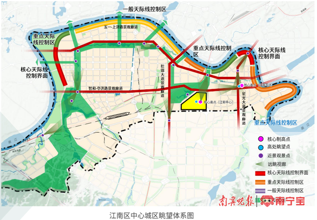构建眺望体系。构建“看江+望湖+观园”眺望体系,提升城市眺望系统的可观性、易观性和适观性。结合中心城区制高点构建远眺观景系统,营造“景”与“观”的良性互动。通过高点眺望、近点观景、观眺动线,构建“鸟瞰—俯瞰一动眺”的多维观景系统。