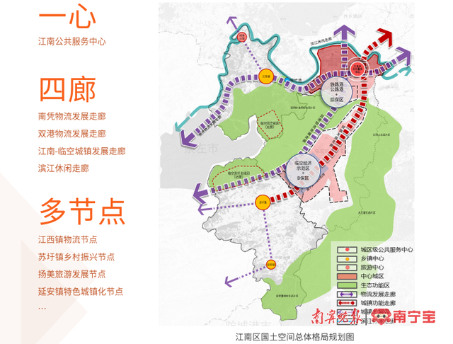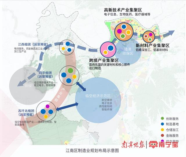 枢纽驱动,打造先进制造业基地。《规划》明确,打造面向东盟的区域物流新枢纽,构建“3+3” 先进制造业格局,构建“两心一圈”现代服务业格局。从港城融合到乡镇一体,优化城乡空间格局。落实西部陆海新通道战略和南宁国家物流枢纽建设要求,落实《南宁总规》对物流枢纽布局要求,发挥江南区区位优势,打造面向东盟的区域物流新枢纽。