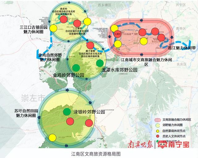 一条邕江魅力休闲带,提升邕江沿岸自然人文景观风貌,优化沿线休闲服务设施,依据不同主体提升邕江休闲旅游的体验感;一个城市文商旅融合魅力休闲区,以中心城区历史文化旅游、商贸文化旅游、自然生态旅游为主,打造文商旅融合的城市消费圈;三个近郊魅力休闲圈,分别为三江口古镇田园魅力休闲圈、苏圩镇自然田园魅力休闲圈、金鸡自然郊野魅力休闲圈。