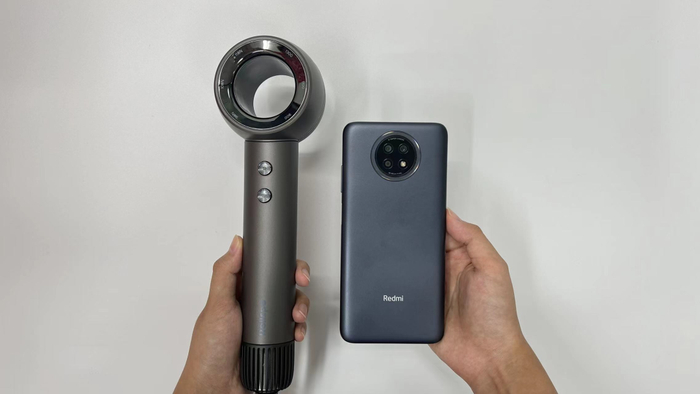 而它通过调整吹风机重心,减小风嘴长度,举起来很轻便。