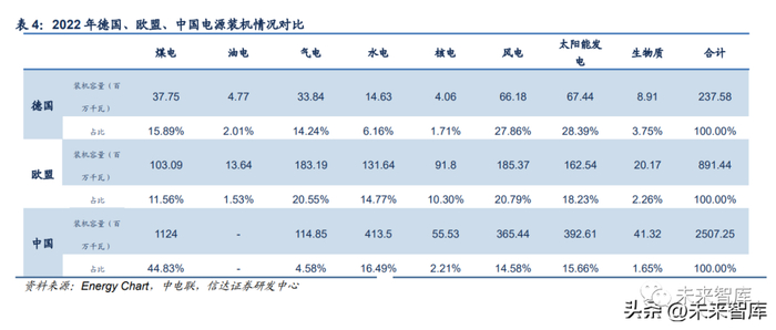调节资源方面,我国灵活性资源较欧美先天不足。我国电力系统内可用的灵活性资源包括 可控电源机组、电化学储能、抽水蓄能和需求侧响应等。提升调节能力是实现新能源大规 模消纳的必要条件。相较于新能源渗透率更高的欧盟与德国(截至 2022 年末,欧盟新能源 渗透率达 22.9%,德国新能源渗透率达 36.7%,我国新能源渗透率仅为 13.7%),我国的 优质调节资源气电装机占比较低,调节能力较差的煤电装机占比较高,调节能力相对较差。因此在未来较长一段时间内,结合潜力规模和经济性来看,我国新能源消纳的着力点或应 以火电灵活性改造、抽水蓄能电站、电化学储能、可调节负荷为主加快投资建设,加快提 升电力系统调节能力。