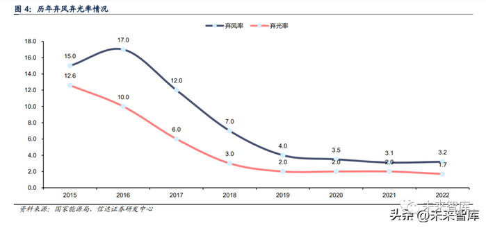 当新能源电量占比和装机占比逐渐升高时,系统消纳新能源的难度逐渐加大。“十三五”初 期,新能源电量占比仅 5%左右时,全国性的风电消纳的问题曾严重凸显,平均弃风率达 15%以上。国家能源局通过出台制定解决弃风弃光弃水“三弃”问题的实施方案,弃风弃光 率逐步下降,在 2019 年即被控制在 5%以内。但在 2022 年新能源电量占比已经接近 15% 时,持续向下的弃风率反而出现边际升高,表明消纳的成本与难度随新能源渗透率出现同 步抬升。