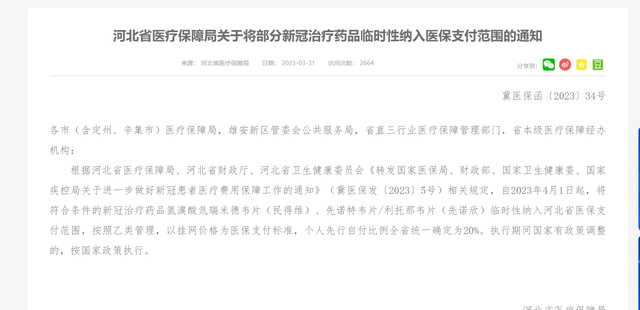 以河北为例,其个人先行自付比例远高于南京:河北省医保局曾发布《关于将部分新冠治疗药品临时性纳入医保支付范围的通知》,自2023年4月1日起,河北省也将符合条件的新冠治疗药品民得维、先诺欣临时性纳入河北省医保支付范围,按照乙类管理,以挂网价格为医保支付标准,个人先行自付比例全省统一确定为20%。
