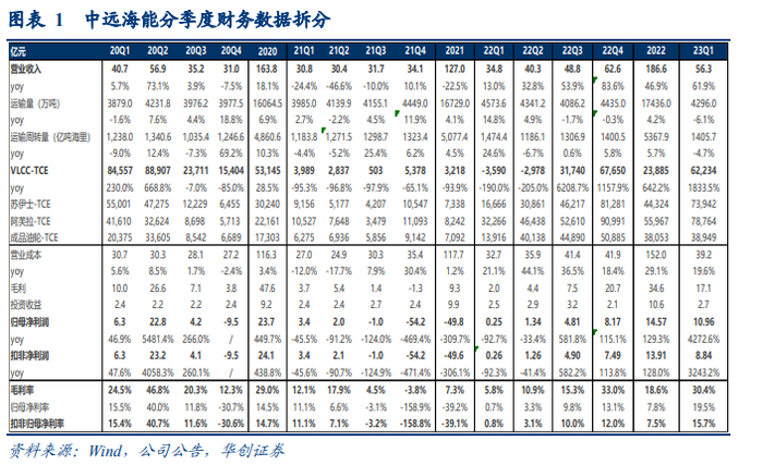 2023Q1油运营收24.2亿元,同比+119.5%、环比-14%;油运净利润7.6亿元,同比+3283%、环比-16%。