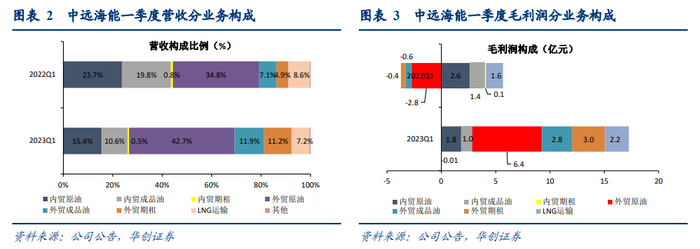 收入毛利拆分:2023Q1内贸、外贸、LNG运输营收分别为15.0、37.0、4.1亿,同比-2.9%、+127.8%、+35.8%;营收占比26.6%、65.8%、7.2%。