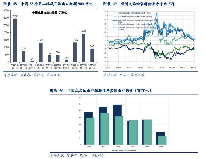 同时需要注意到实际成品油出口量较配额量或有所差异,根据金联创统计1-5月实际出口约占首批配额总体进度82%,Kpler口径下截至5.14出口约占首批配额的70%。