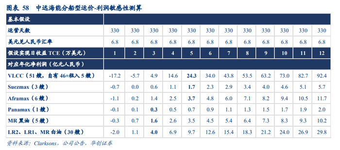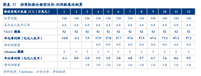 Panamax、MR(黑油)、LR2+LR1+MR(白油)在日收益TCE均值3万假设下年化净利润0.3、1.6、4.0亿元,合计6.0亿元;TCE每波动1万美元/天对应净利润弹性0.2、1.0、2.9亿元,合计4.0亿元。