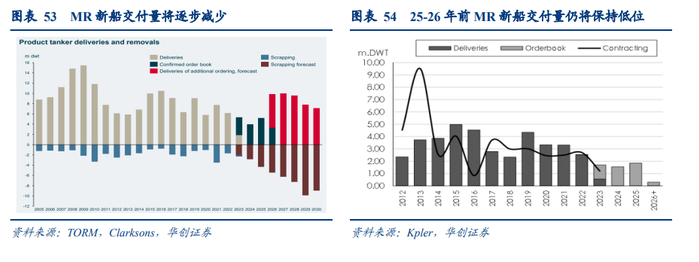 供给端,MR新船新单比例目前仍处低位,成品油轮相较VLCC供给约束程度相对低,新船订单有所增加(LR2尤为明显)。但考虑环保新规下航速限制有效运力+老旧船退出合规市场或进入灰色贸易船队+老旧船潜在拆解出清可能带来供给减量,未来实际供给增速或相对可控,后续需继续观察成品油轮新船订单释放情况。