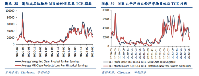 二、成品油轮:运距逻辑兑现,MR中期景气上行趋势延续,关注供给边际变化。