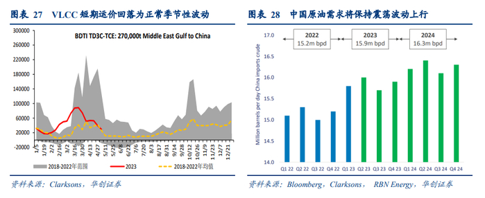 需求端看好中国复苏对VLCC运需支撑,以及下半年大西洋至远东的长航线货盘增量,23Q4旺季弹性可期。