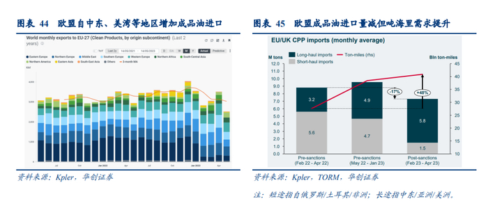 欧盟成品油进口替代方向上,实际落地情况来看欧盟增加自中东、美湾、印度、亚洲等地区进口,运输距离均明显长于俄罗斯。