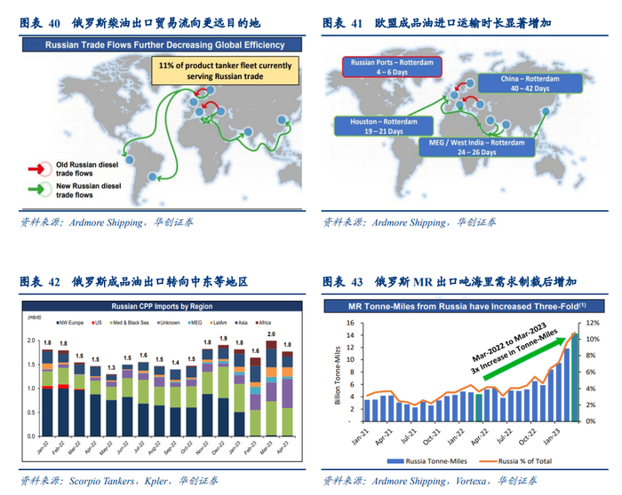 尽管由于需求转弱、制裁前主动累库,2-4月欧盟成品油进口量同比有所下滑,但进口运距拉长、长航线货盘增加有利于吨海里需求同比明显提升。