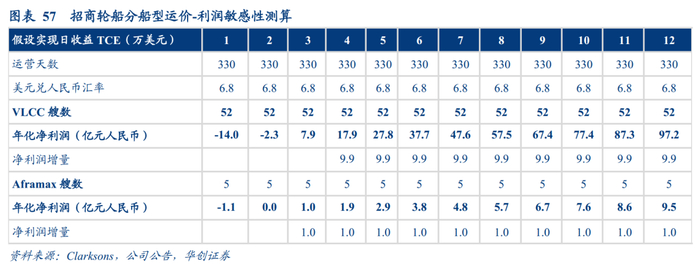 按照景气周期运价均值测算,VLCC、Suezmax、Aframax在日收益TCE均值5万假设下年化净利润24.3、1.7、3.7亿元,合计29.7亿元;TCE每波动1万美元/天对应净利润弹性9.7、0.6、1.1亿元,合计11.4亿元。
