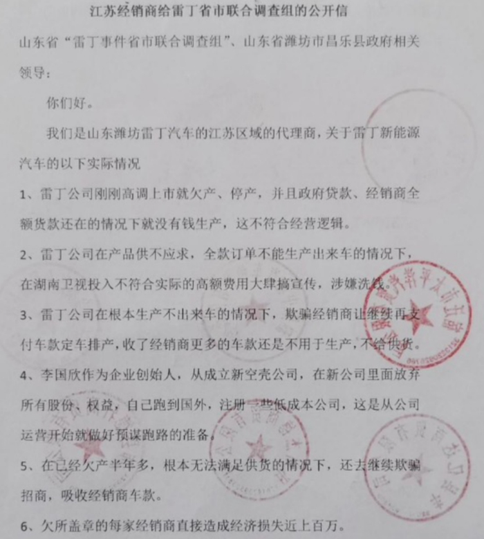 屋漏偏逢连夜雨,今年2月,雷丁汽车被经销商联名举报,经销商集体签字盖章的《江苏经销商给雷丁省市联合调查组的公开信》中认为,雷丁汽车是一家诈骗公司。