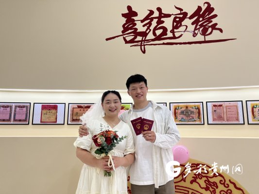 26岁的陈治霖称,领到结婚证后,也感到沉甸甸的责任感。他与爱人殷夕蔚谈恋爱2年,异地1年。“之前我在黔南工作,他在安顺。一到周末,他便坐高铁来看我。跟他在一起的每一天都很开心。”殷夕蔚说。