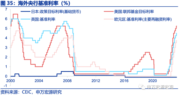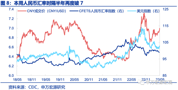 美元指数走强的压力可能在下半年出现一定缓释。上文第二部分我们详细分析了近期公布的美国4月供需两端经济数据均较强,印证我们早在3月就提出的美国经济年内可能超预期、通胀下行可能慢于预期的观点,进而支撑近期美元指数阶段性走强,当然美联储官员近期密集讲话也是重要的催化剂。往后来看,无论美联储是否将在6月加息与否,美联储加息进程都已经临近尾声,下半年必将迎来一段维持高利率不变的时期,这方面可能对人民币汇率的外部因素——美元指数形成一定缓释效果,我们预计年中之前美元指数可能持续在100以上的高位,年末随着超额储蓄消耗殆尽,经济预期转弱,美元指数或回落至98-100左右。