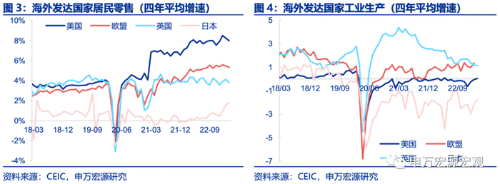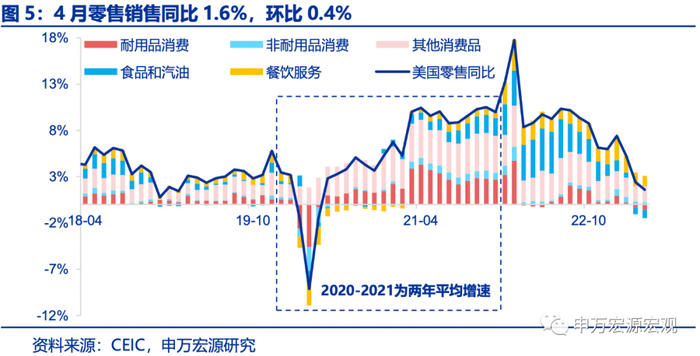 美国4月经济供需两旺,指向经济强韧、通胀缓下行。4月美国零售反弹,凸显美国居民超额储蓄“保驾护航”。当地时间5月16日公布的美国4月零售销售同比1.6%,环比0.4%,略低于市场预期,但剔除汽车和汽油的零售环比达0.6%,远强于预期,凸显仍在万亿美元以上美国居民超额储蓄支撑。4月美国制造业生产大幅反弹,指向美国经济仍维持强势。4月美国工业生产同比0.2%,其中制造业贡献拖累较上月大幅收窄至-0.6%,同时制造业环比贡献高达0.8%,凸显居民需求旺盛下美国工业生产仍然较强,同时也和美国制造业PMI数据的反弹相对应。4月美国经济供需两旺,对应4月核心商品通胀反弹。4月美国经济凸显需求和供给双双转暖的特点,这相应指向美国商品通胀在超额储蓄消耗完毕之前可能会持续出现反弹的情况,这和中观上二手车指数的连续数月反弹是一致的,使得核心商品成为迟滞2023年美国通胀下行的一大因素。