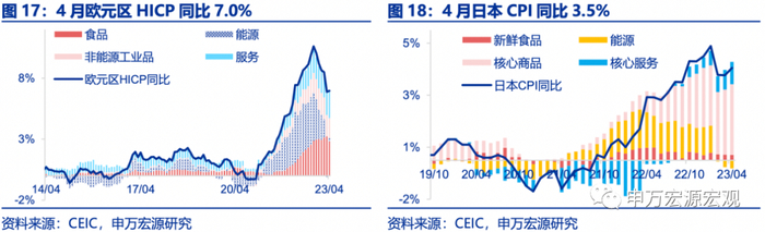 CPI通胀:4月欧日CPI通胀均小幅提升。4月欧元区HICP同比7.0%,其中服务贡献提升。4月日本CPI同比3.5%,核心商品、核心服务贡献继续提升。