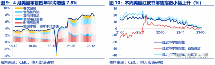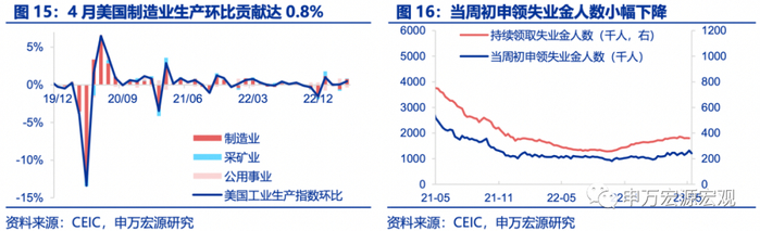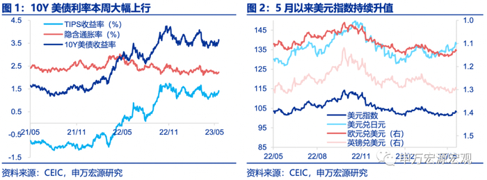 5月以来美元指数大幅走强,主因美联储加息预期再起+海外经济美强欧弱。截止5月19日,10Y美债利率较上周五提升24BP至3.70%(较4月末上升26BP),其中TIPS利率贡献18BP,隐含通胀预期贡献6BP,凸显本周以来美联储官员频频放“鹰”的效果,数位官员表示“通胀进展缓慢,尚未看到6月停止加息的信号”,导致市场对美联储加息预期再起。所以,美元指数较上周五升值0.5%,较4月末升值1.5%,一方面反映美联储加息预期强化,另一方面更凸显海外经济美强欧弱局面并未改变,详见《海外经济美强欧弱局面并未改变-全球宏观周报 · 第109期》(2023.04.22),在超额储蓄保驾护航下,美国就业市场强劲,本周失业金申领数据明显低于预期,同时本周公布的4月零售也凸显美国消费动能仍然强劲,工业生产也具备韧性,我们在下文详细分析。