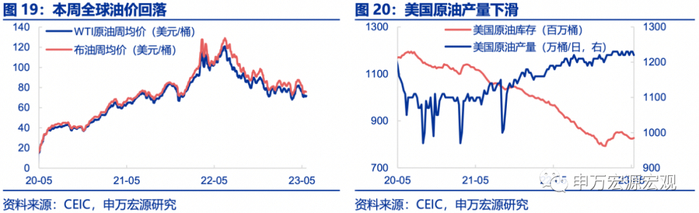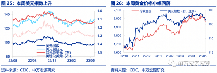 汇率利率黄金:截止5月19日,黄金价格回落至1962美元/盎司,美元指数上升至103.20,10Y美债利率回升至3.70%。