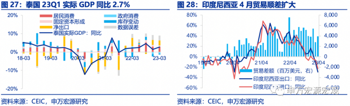 泰国一季度实际GDP高于预期,印度尼西亚4月贸易顺差扩大。泰国2023年一季度实际GDP同比增长2.7%,高于市场预期,主要推动因素来自于居民消费和固定投资的上升。4月印度尼西亚进口量收缩幅度大于出口额,导致贸易顺差较上月扩大至39.4亿美元,进口同比-22.3%,出口同比-29.4%。