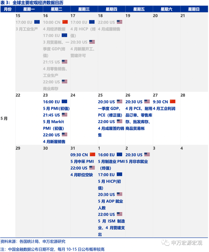 供给与就业:4月美国制造业生产环比0.8%,截止5月13日,当周当周初申领失业金人数回落至24.2万人,反观3月欧元区工业生产环比-4.1%,印证上周公布的德国工业生产数据的走弱,4月英国就业减少14万人。
