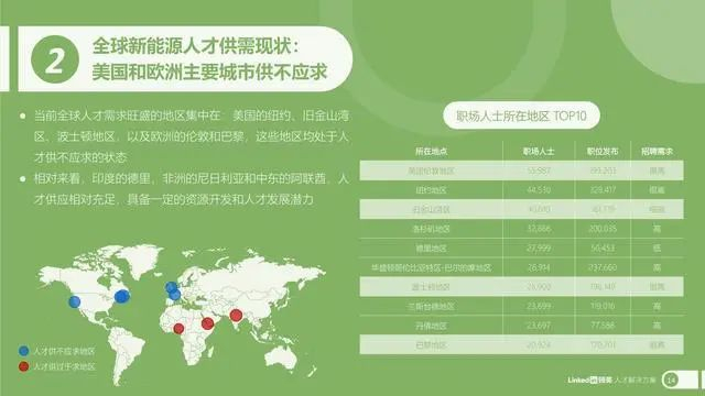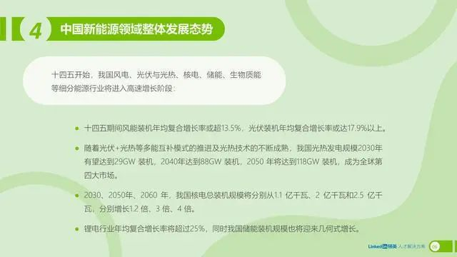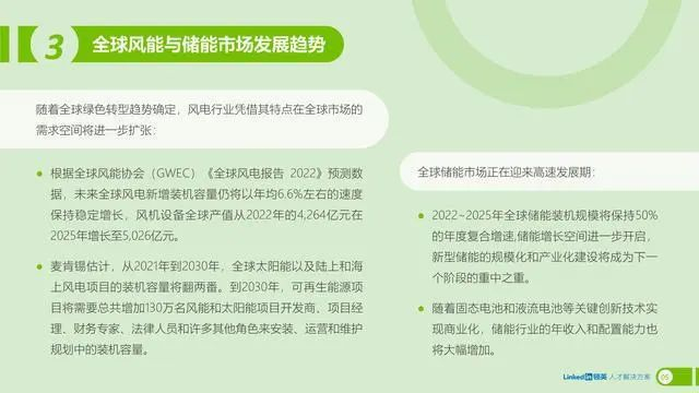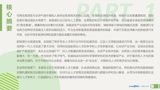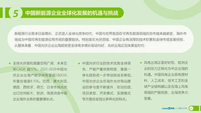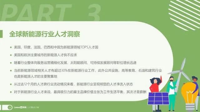 在这样的背景下,本报告立足于领英独家人才大数据,从全球视角出发,围绕新能源行业,特别是光伏和风能领域的发展机遇和前沿议题进行全面剖析,针对行业人才供需及发展趋势进行数据分析和深入解读,从而为中国新能源企业提升人才竞争力,打造国际化人才布局提供前瞻性的洞察和策略建议。