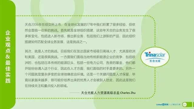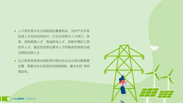 以光伏产业为例,全球光伏制造端扩产意愿强烈,龙头企业加速扩产,对人才数量的需求成倍增长,光伏产业技术创新,对研发人员的需求量也在急剧增大;另一方面,作为综合了电子电气、机械自动化和材料学等跨学科的技术密集型产业,对于复合型人才也的需求也更为强烈。对于中国光伏企业来说,随着光伏企业进一步“走出去”,对国际化人才的需求也与日俱增。