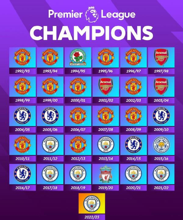 在本赛季夺冠之后,曼城也成功实现了英超联赛的三连冠——他们在2020-2021、2021-2022以及2022-2023三个赛季都成功问鼎。