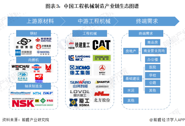 工程机械产业上游主要为制造工程机械产品提供原材料的钢铁行业、涂料行业和零部件制造业,如工程机械用钢材、内燃机、液压系统、轴承、轮胎等。中游包括挖掘机、起重机、压路机、推土机等不同类型的工程机械制造企业;下游主要为对工程机械有需求的行业,如基础设施建设、房地产、矿山挖掘、水泥以及农村建设等。