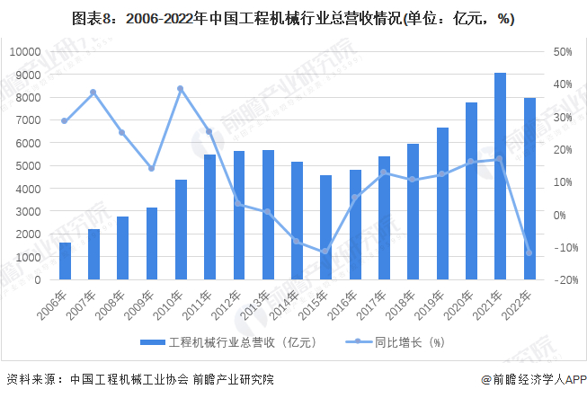 据中国机械工业联合会数据,2022年工程机械行业营业收入降幅超过12%,前瞻初步统计,2022年,中国工程机械行业营业收入为7977亿元。