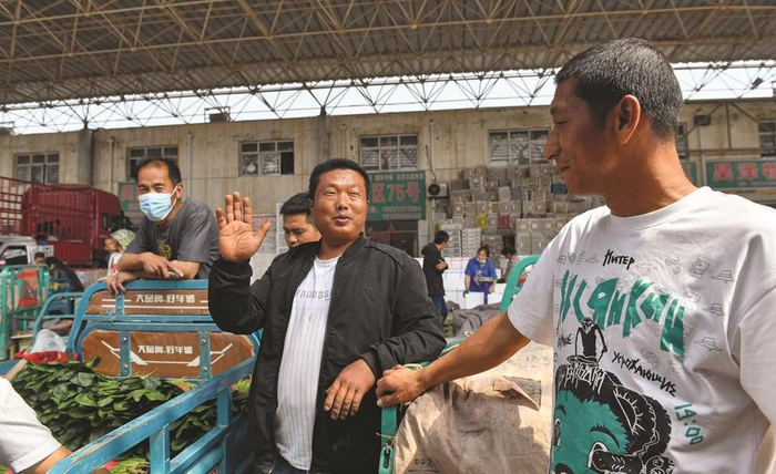 5月18日,来自辽宁丹东、微信名叫“黑哥”的货车司机(右),称赞蔬菜批发商的菠菜挺好,让当地批发商倍感自豪。 本报记者 李磊 摄