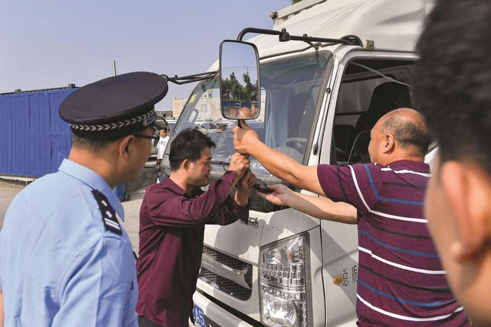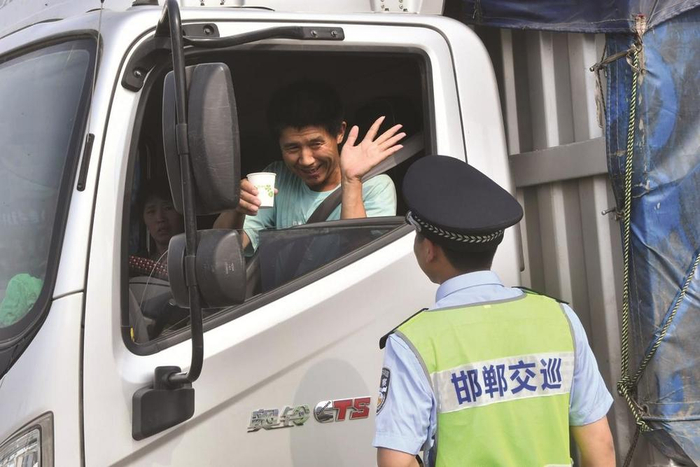 民警客气地说:“我是邯郸交巡警,您停在路边影响交通,临时停车路边是违规行为,且车厢后面放大号污损。不过请放心,邯郸市对外地来邯车辆首次轻微违法不罚,对您不予处罚,咱能不能把车挪一下?”说着,交巡警找来毛巾,帮刘师傅擦干净了车厢后面的放大号。