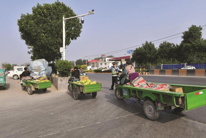 5月18日,邯郸交巡警在南大堡蔬菜批发市场门前劝导逆行运菜电动三轮车驶离公路。市内很多小商贩会骑三轮车来此批发蔬菜,交巡警引导车辆有序通行。 本报记者 李磊 摄