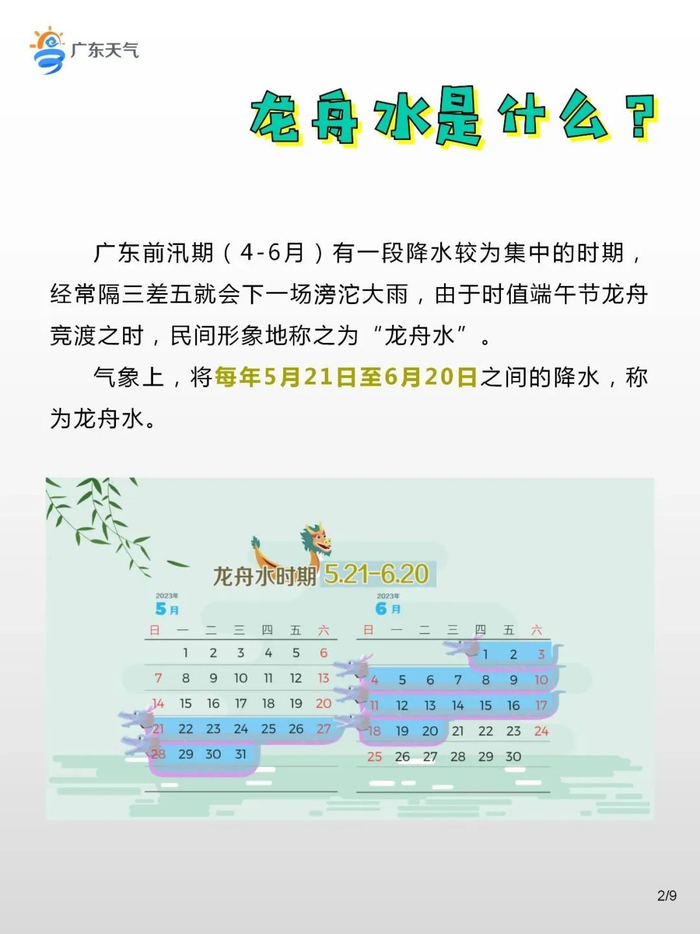 广东前汛期(4-6月)有一段降水较为集中的时期,经常隔三差五就会下一场滂沱大雨,由于时值端午节龙舟竞渡之时,民间形象地称之为“龙舟水”。气象上,将每年5月21日至6月20日之间的降水,称为龙舟水。