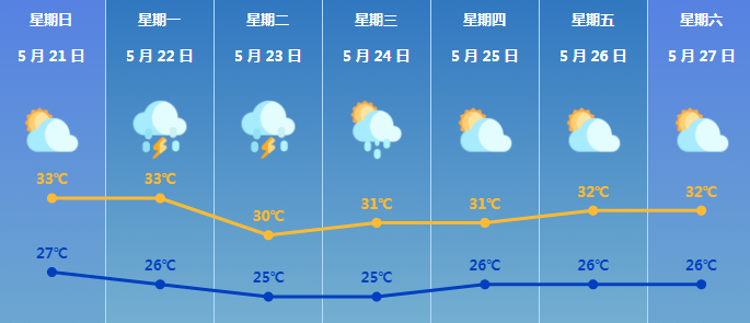 预计今天我市晴热天气持续,偶有短时阵雨;22-23日受冷暖气流交汇影响,我市有雷雨,局部雨势较大并伴有短时大风;24日仍有阵雨,展望25-27日多云有阳光,天气再趋炎热。▼