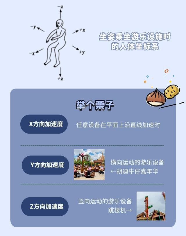 与车、船、飞机相比,游乐设施运行起来的速度和角度变化更大,造成的晕动现象可能更为严重。如果以人体和座椅之间的关系建立坐标系,游客实际上受到了来自x、y、z三个方向的正负G加速度,G加速度可以衡量游客与设备的相对运动状态和相对位置,这种变化将直接被人的敏感的前庭系统捕捉到。