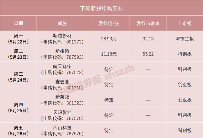 下周多只新股的网上申购数量上限不高,顶格申购需配市值的要求不高,航天环宇、新莱福只需6.5万元市值可顶格申购,鑫宏业只需6万元市值可顶格申购,西山科技只需3.5万元市值可顶格申购。