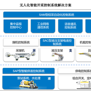 其主要产品包括SAM(System of Automatic Mining)型综采自动化控制系统、SAC(System of Shield Automatic Controlling)型液压支架电液控制系统、SAP(System of Automatic Pumping)型智能供液控制系统三大系统,以及备件和相关运维服务。如SAM型综采自动化控制系统,可以根据煤层赋存条件、工作面设计参数、产能指标等要求,依托无人化开采工艺、智能感知导航定位及工作面装备协同连续开采控制等专利技术,在综采工作面单机设备自动化基础上,通过工业以太网、现场总线,将人的视觉、听觉延伸到工作面,形成集感知、决策、执行、控制为一体的集中控制系统。该系统可适应薄煤层、中厚煤层、大采高、放顶煤等各种采煤工作面。
