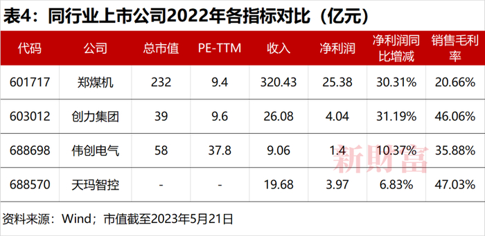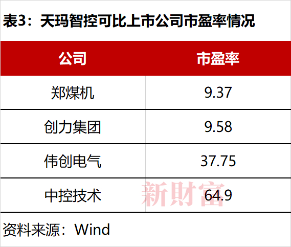 截至2023年5月21日,天玛智控的可比公司中,最低市盈率为郑煤机(601717)的9.37倍,最高市盈率为中控技术(688777)的64.9倍(表3)。