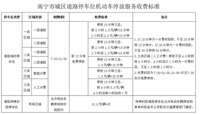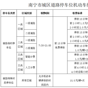 南宁市道路临时停车位收费时段为7:30-21:00,其余时段免费开放。收费时段中,前15分钟免费,之后按照不同的区域级别实行不同的收费标准,折算后每小时3-8元不等。按照该标准计算,如果在南宁市一类区域一级道路临时停车位停车一天,将被收取102元的停车费。