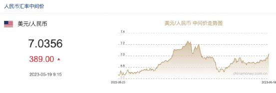 昨日,中国人民银行授权中国外汇交易中心公布,2023年5月19日银行间外汇市场人民币汇率中间价为1美元对人民币7.0356元。最近三个交易日,人民币中间价已下跌850个基点,跌幅超过1.2%。