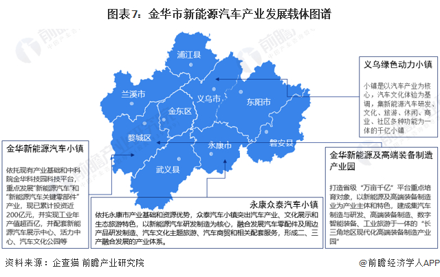 金华市规划布局了“3(镇)+4(基地)”新能源汽车及关键零部件产业发展平台。“3镇”即“金华开发区新能源汽车小镇”“义乌绿色动力小镇”和“永康众泰汽车小镇”,“4基地”即婺城、兰溪、武义、东阳4大汽摩配产业基地。先发优势明显、产业体系健全、集聚态势初显、推广成效显著、要素保障有力已成为金华汽车产业发展优势。