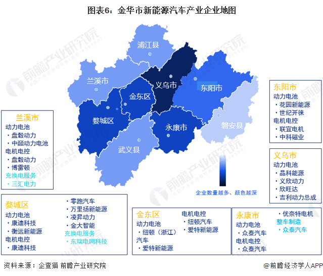 在政策指引和市场需求的驱动下,金华市新能源汽车产业链不断完善,其中,在原材料/元器件环节、产业链上中下游均有较多企业布局: