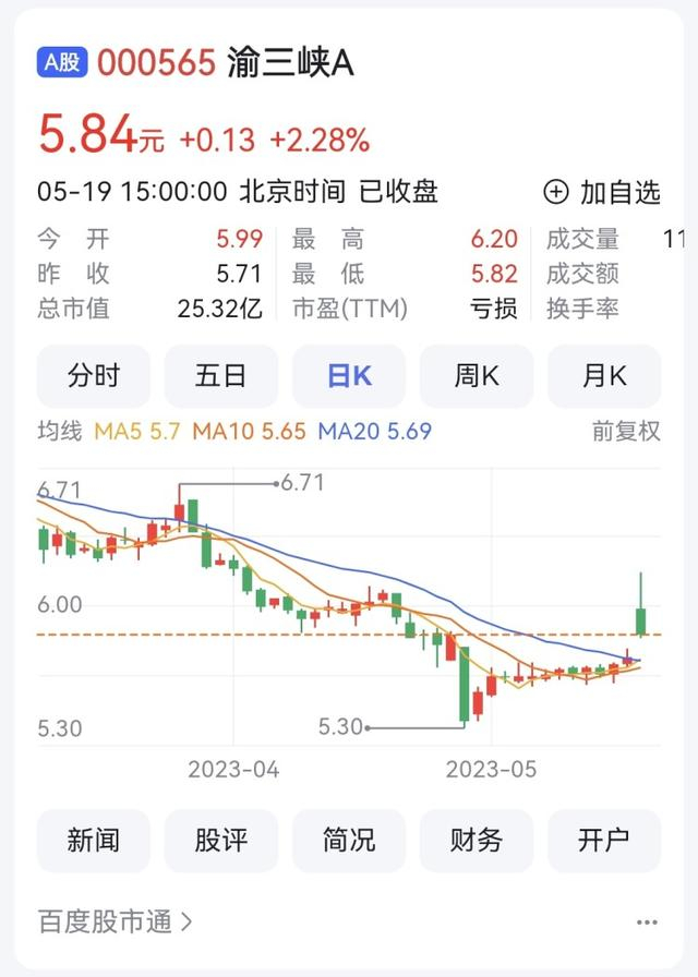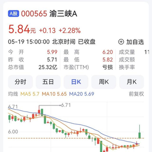 5月19日,渝三峡A报收5.84元,涨2.28%,换手率2.68%,滚动市盈率亏损 ,总市值25.32亿元。