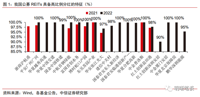 我国公募REITs具备高比例分红的特征。根据沪深交易所发布的《公开募集基础设施证券投资基金(REITs)业务办法(试行)》:“基础设施基金以获取基础设施项目租金、收费等稳定现金流为主要目的,收益分配比例不低于合并后基金年度可供分配金额的90%”。从实操情况看,大部分公募REITs的实际分红比例均高于90%,其中多只个券2022年的实际分红比例达到或接近100%,体现出我国公募REITs高比例分红特征。